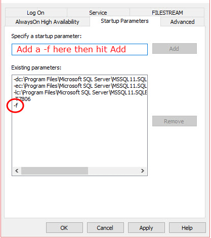 Please be sure to verify the file path used above. Otherwise, you would fail to start up the SQL server instance after you bounce the services.