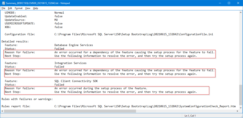 At first, it was not clear what the cause of this error was. First, I looked at the summary log by clicking on the hyperlink provided by the above window to look for more information. Scrolling down in the log, I found several errors related to failed components: