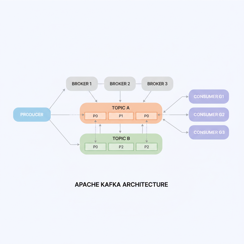 Picture Kafka as a distributed post office for massive data volumes. Producers (apps sending data) drop messages into topics—logical channels like mailboxes. These topics split into partitions across brokers (Kafka servers) for scalability and parallelism. Consumers subscribe to topics, pulling messages at their pace, with replication ensuring no data loss even if servers fail.
